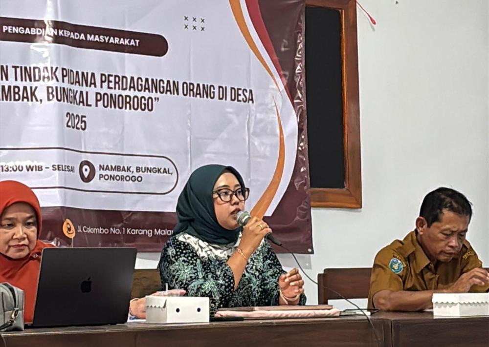Lecturers from the Faculty of Law at Universitas Negeri Yogyakarta (FH UNY) have conducted a community service program titled “Prevention of Human Trafficking Crimes” in Nambak Village, Bungkal District, Ponorogo Regency on September 30, 2025. This initiative aligns with Sustainable Development Goals (SDGs) 16, which emphasizes building peaceful societies, ensuring access to justice, and establishing strong institutions. The community service program featured three legal experts as speakers. The first speaker, Iffah Nur Hayati, S.H., M.H., opened the session by providing an overview of the national legal framework concerning human trafficking crimes. The second speaker, Maryamul Chumairo A, S.H., M.H., elaborated on the theoretical aspects of human trafficking, including regulations, criminal elements, and the social and legal impacts on vulnerable communities.