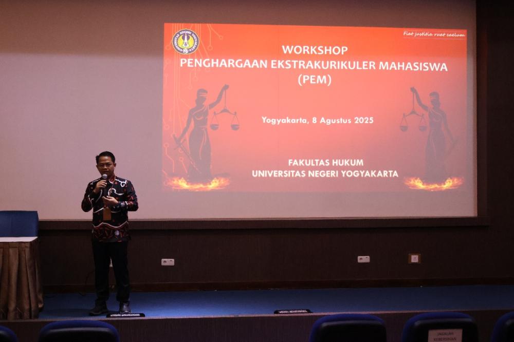 Penghargaan Ekstrakurikuler Mahasiswa (PEM) merupakan program yang diluncurkan Universitas Negeri Yogyakarta dalam rangka mendorong mahasiswa UNY untuk mendorong mahasiswa UNY untuk merencanakan, melakukan, dan mengadministrasikan kegiatan ekstrakurikuler secara berkala setiap semester. Sehingga akumulasi dari kegiatan ekstrakurikuler tersebut memberikan lulusan UNY penguasaan hard skill dan soft skill yang seimbang. Pada Jum’at 8 Agustus 2025 Fakultas Hukum UNY menyelenggarakan kegiatan sosialisasi PEM dalam rangka mendorong prestasi mahasiswa dan Sebagai bentuk komitmenfakultas hukum UNY untuk menghasilkan lulusan yang unggul, kreatif, dan inovatif berkelanjutan. Kegiatan tersebut menghadirkan Dr. Arwan Nur Ramadhan, staf ahli Direktur